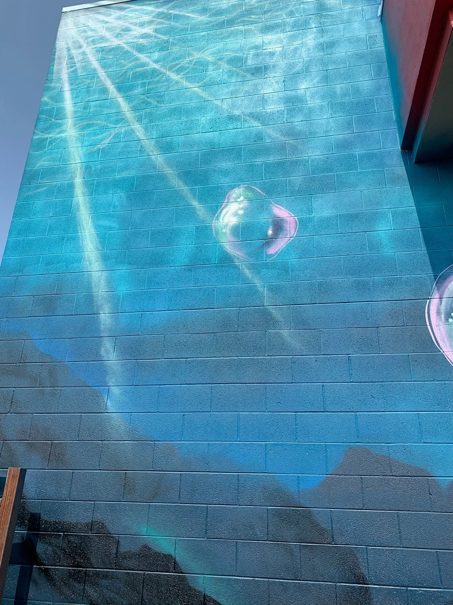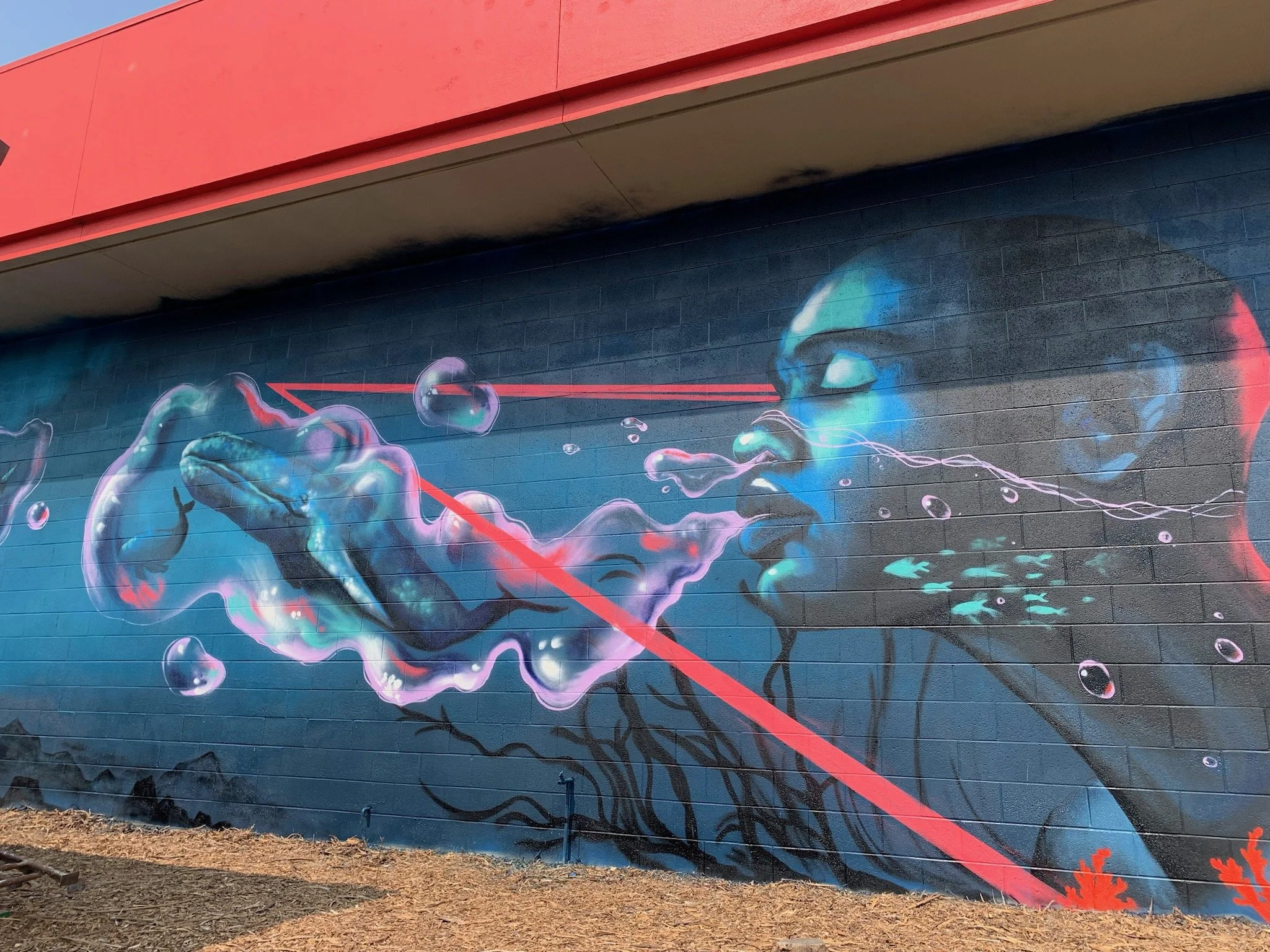Santa Cruz Seawalls mural highlighting environmental issues around our oceans/Mural de Santa Cruz Seawalls que destaca los problemas ambientales en torno a nuestros océanos. Mural “Guardian of The Deep/Guardiana de las Profundidades” by Zoe Boston @zoeadiahboston.
